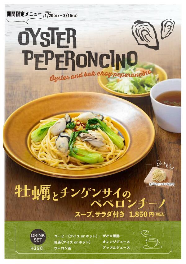 ●期間限定メニュー● OYCTER PEPERONCINO 牡蠣とチンゲンサイ のペペロンチーノ〜 スープ・サラダ付き 1,850円(税込) もっちもち生パスタ〔リングイネ〕使用