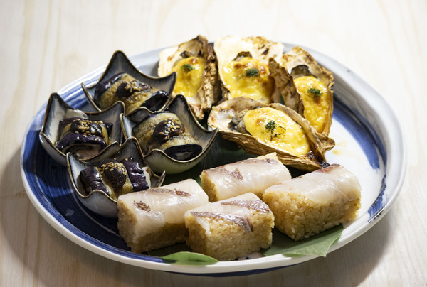 | 焼物盛り | 牡蠣チーズ 茄子田楽 地魚棒寿司 |