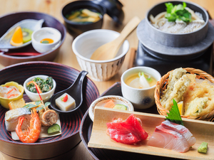 季節毎に変わる、華やかな彩り重箱御膳と名物の釜めしがついた