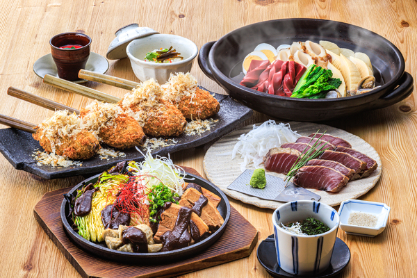 【名物】初鰹の三保松原焼きと春の食材の極上出汁おでん、当店でしか召し上がれない十千焼きなど名物料理勢ぞろいの宴会コースです。