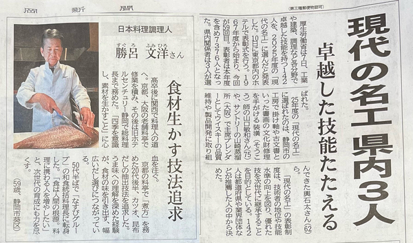 厚生労働省から2025年度の現代の名工に、弊社和食統括料理長・勝呂 文洋を選出いただきました。 「現代の名工」とは、卓越した技能を持ち、その道で第一人者と目されている技能者を、厚生労働大臣が表彰する制度です。 2025年度は静岡県から3名が選出されました