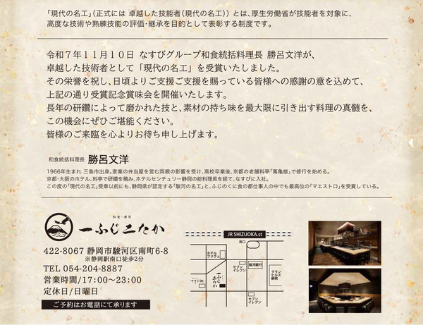 令和7年11月10日 なすびグループ和食統括料理長 勝呂文洋が、